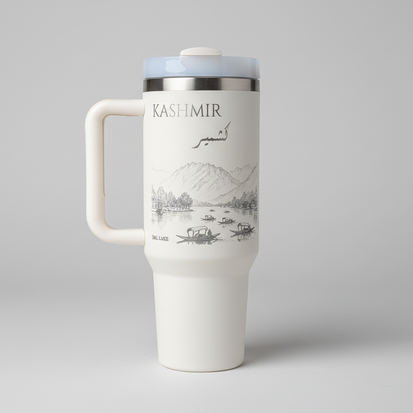 كوب كشمير سعة 40 أونصة للمشروبات الساخنة والباردة. منقوش عليه صورة بحيرة دال الجميلة. يأتي مع غطاء ومقبض وماصة.