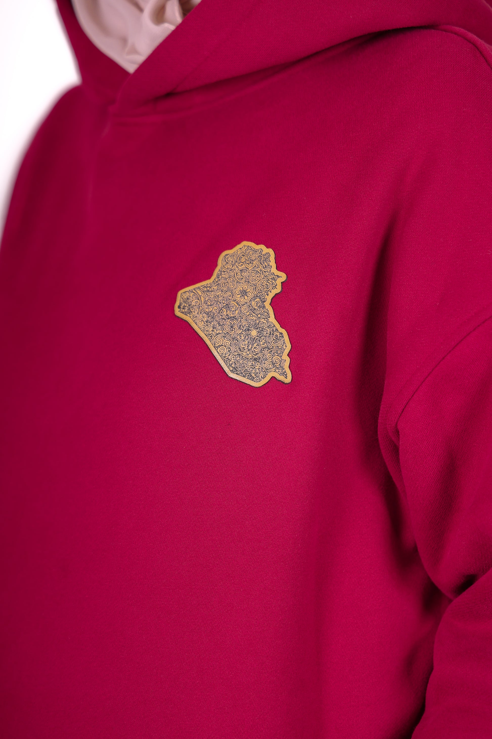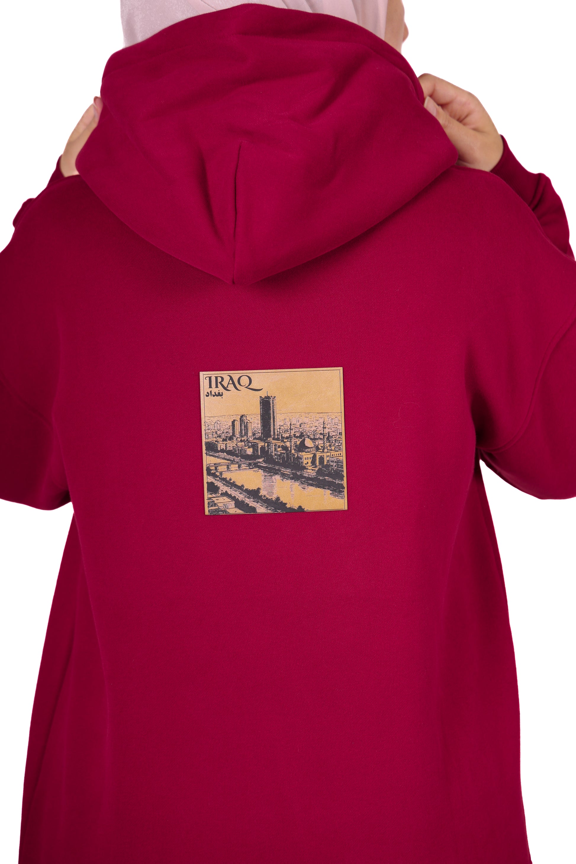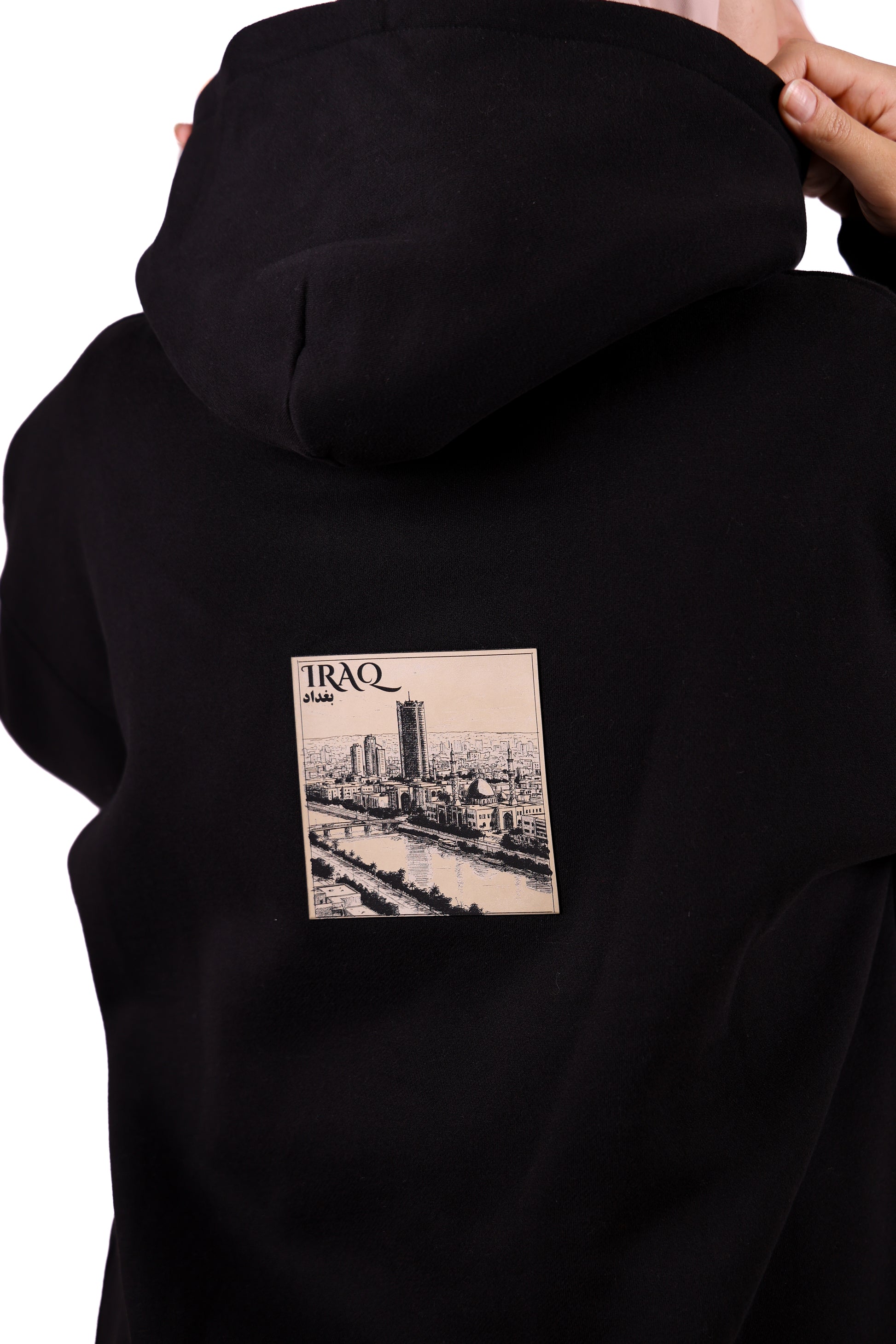 Le sweat à capuche Irak est orné d'une gravure représentant la ville historique de Bagdad. L'écusson avant arbore une carte et des motifs culturels. Confectionné en tissu épais (100 % coton), il est doté d'un écusson en similicuir de haute qualité et a été conçu en interne.