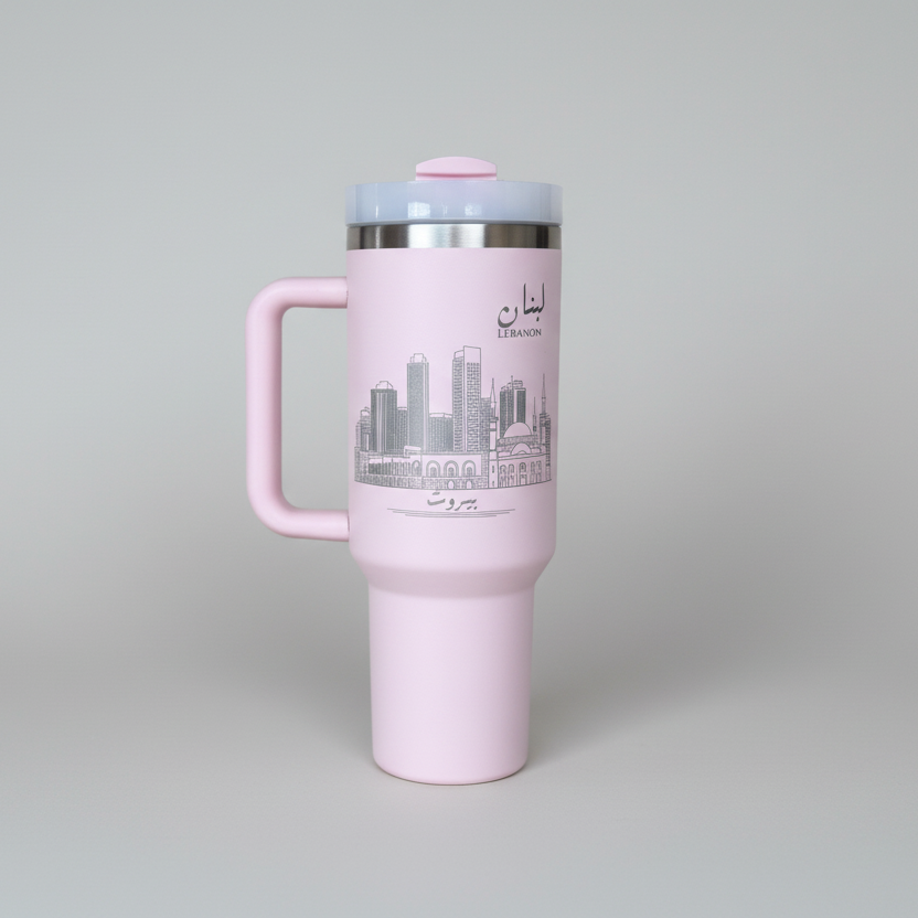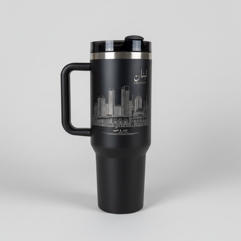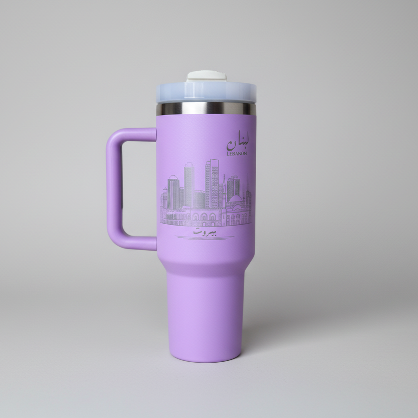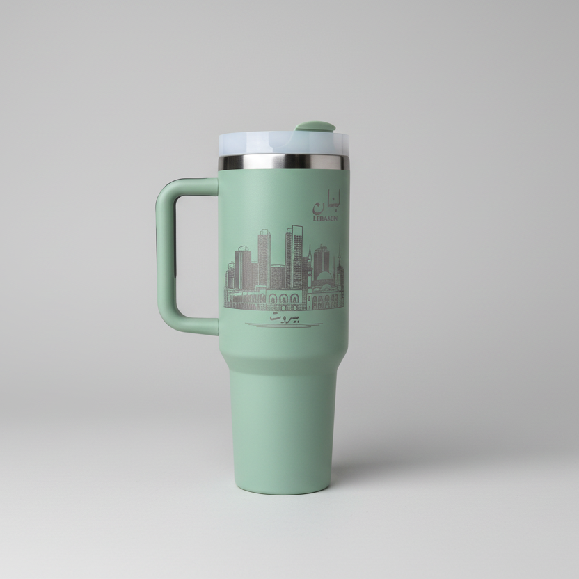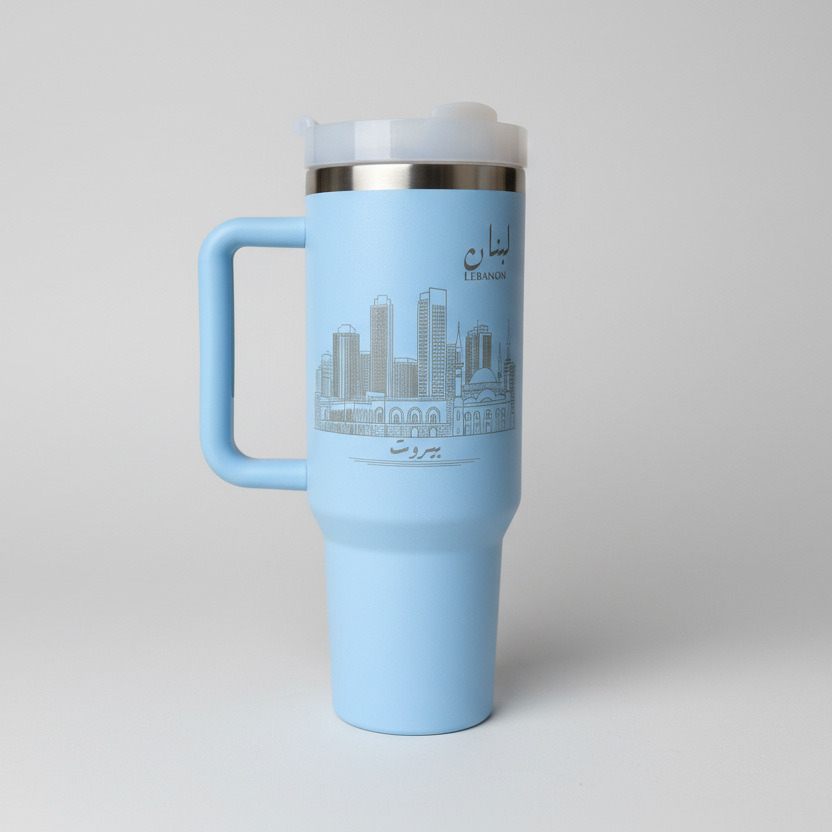 Magnifique gobelet isotherme de 1,2 litre (40 oz) orné d'une illustration de la ville de Beyrouth, au Liban, idéal pour vos boissons chaudes et froides. Il est fourni avec un couvercle, une anse et une paille.
