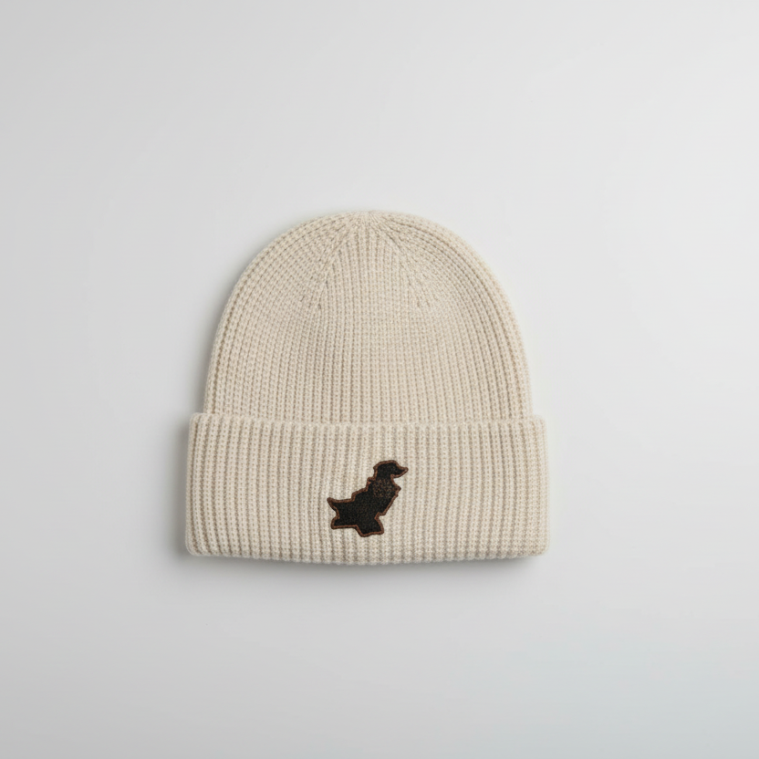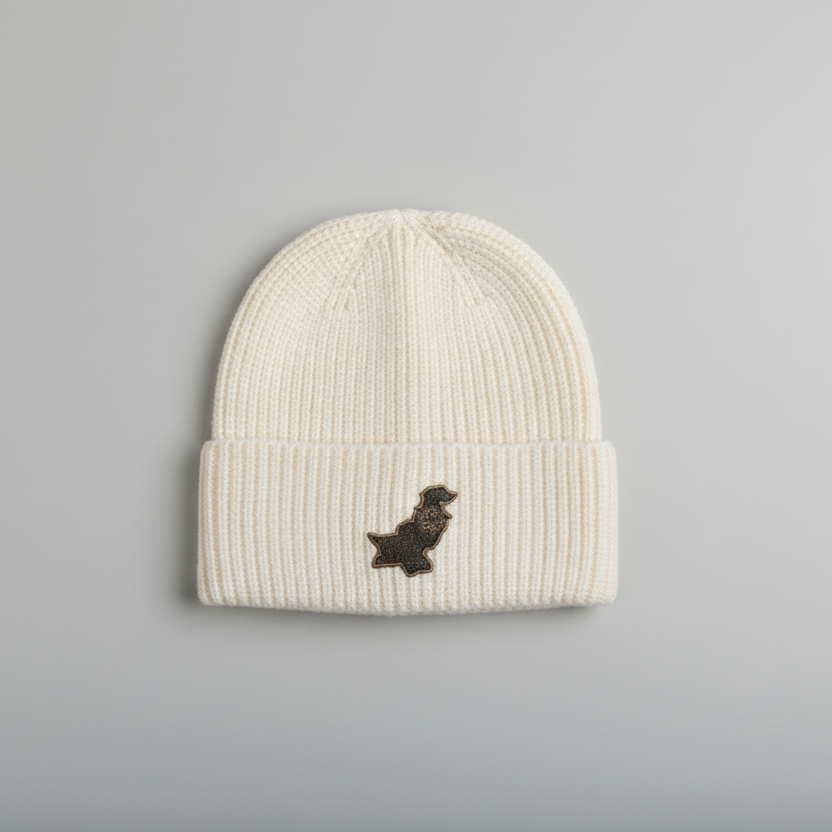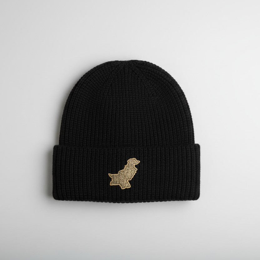 Bonnet pakistanais orné d'un écusson en similicuir gravé au laser représentant la carte du Pakistan. Confortables, respirants et épais, nos bonnets sont conçus pour durer.