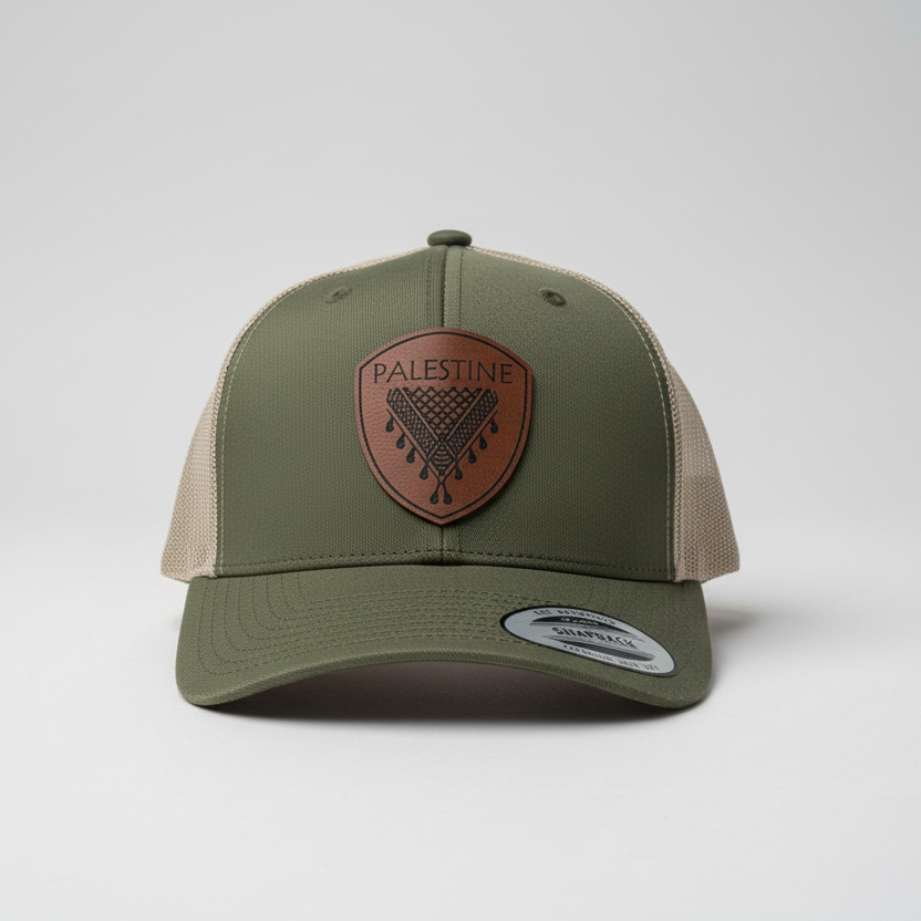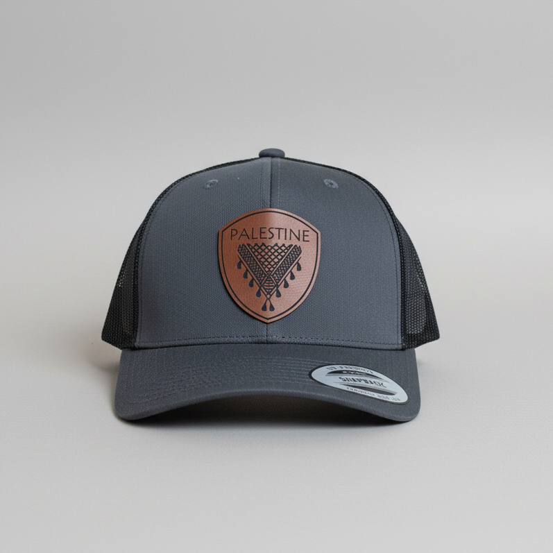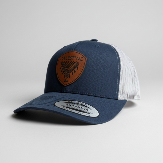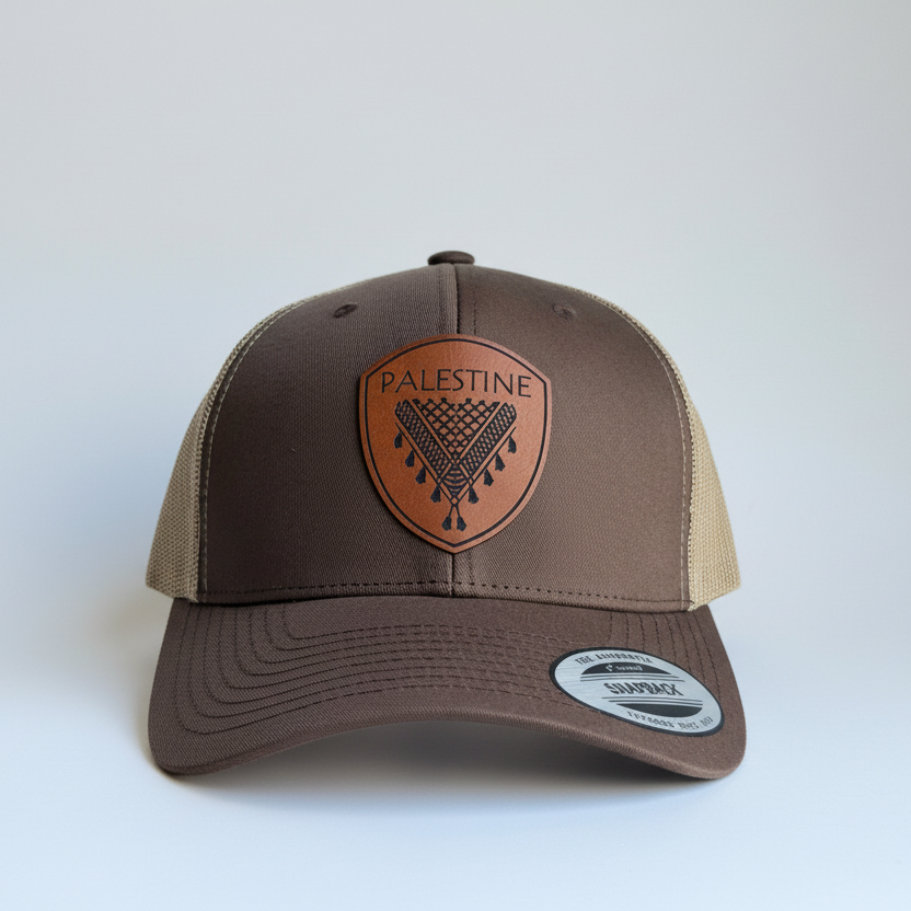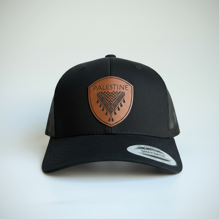 Le keffieh palestinien est orné d'un empiècement en similicuir de haute qualité gravé d'un motif de keffieh. Tous les chapeaux sont confectionnés selon le modèle classique Yupoong 6606, un modèle emblématique.