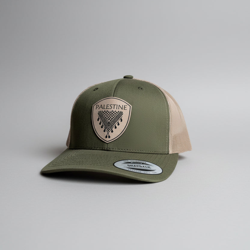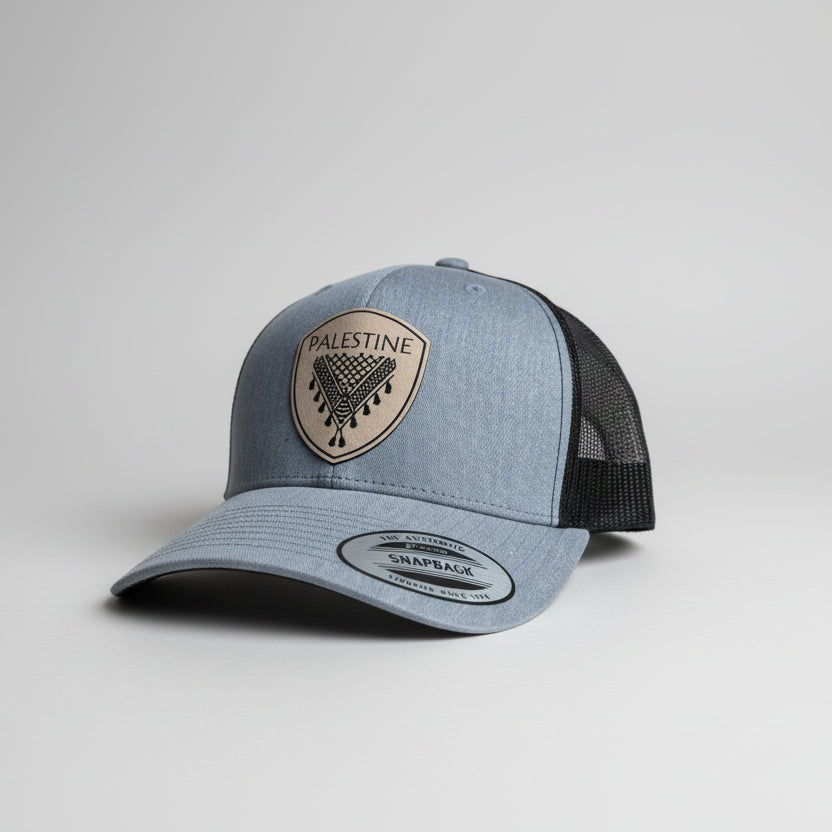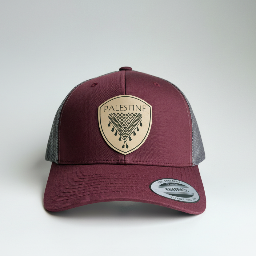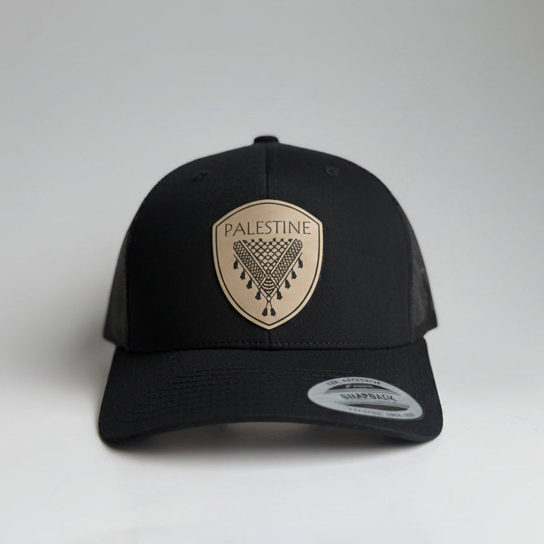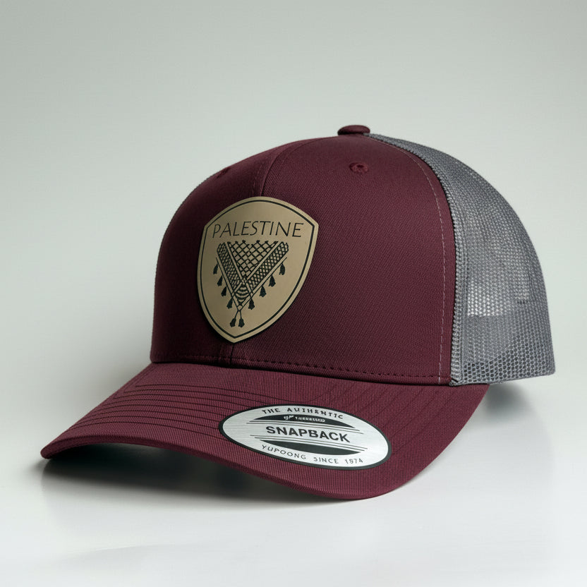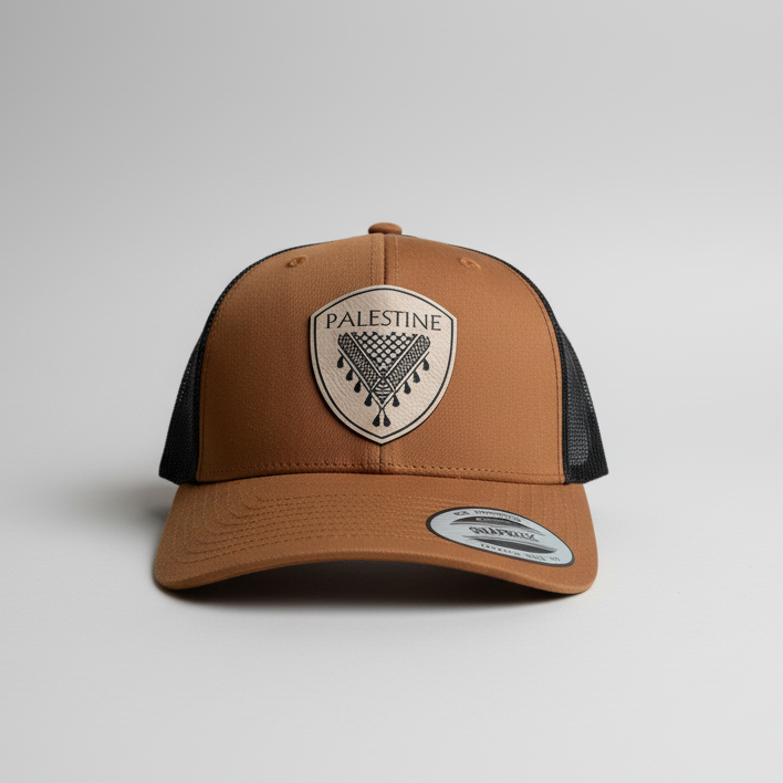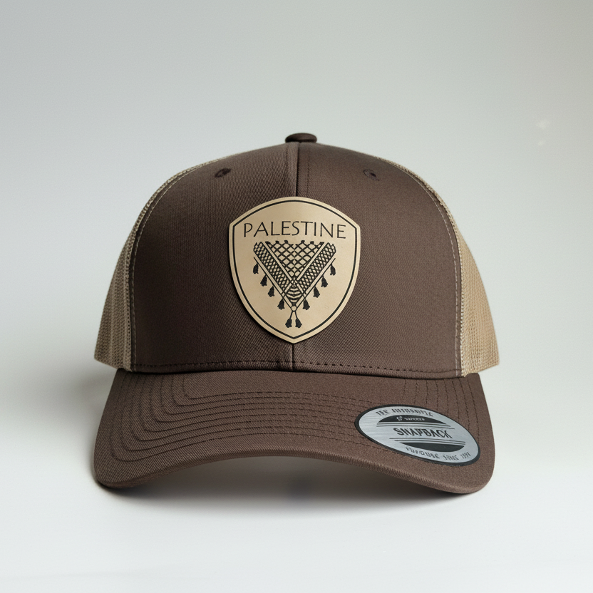 Le keffieh palestinien est orné d'un empiècement en similicuir de haute qualité gravé d'un motif de keffieh. Tous les chapeaux sont confectionnés selon le modèle classique Yupoong 6606, un modèle emblématique.