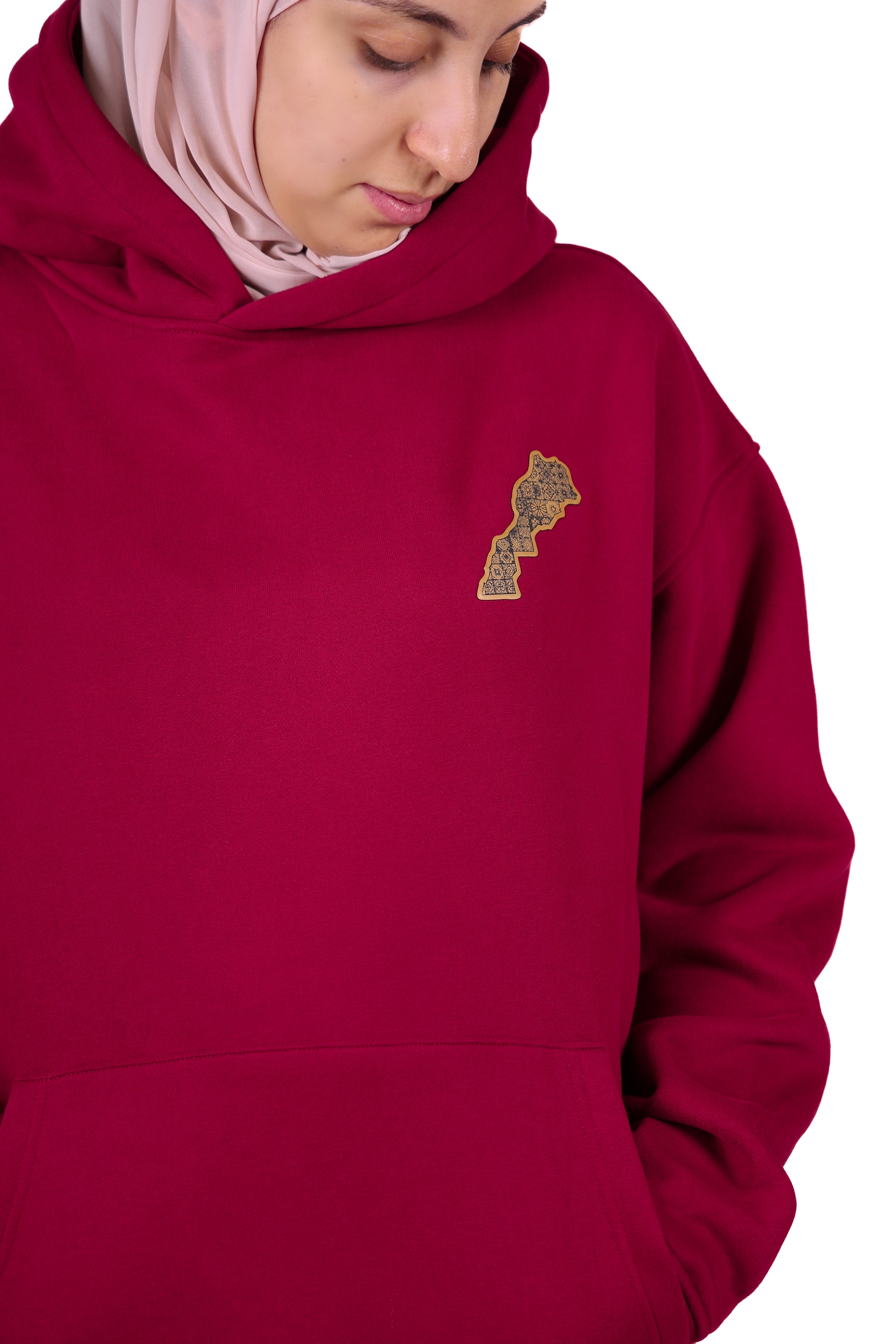 The Morocco Hoodie is engraved with the Hassan II Mosque. The front patch is designed with the map, engraved with zilij designs. It's made with heavy weight fabric (100% cotton), high quality leatherette patch and designed in-house.